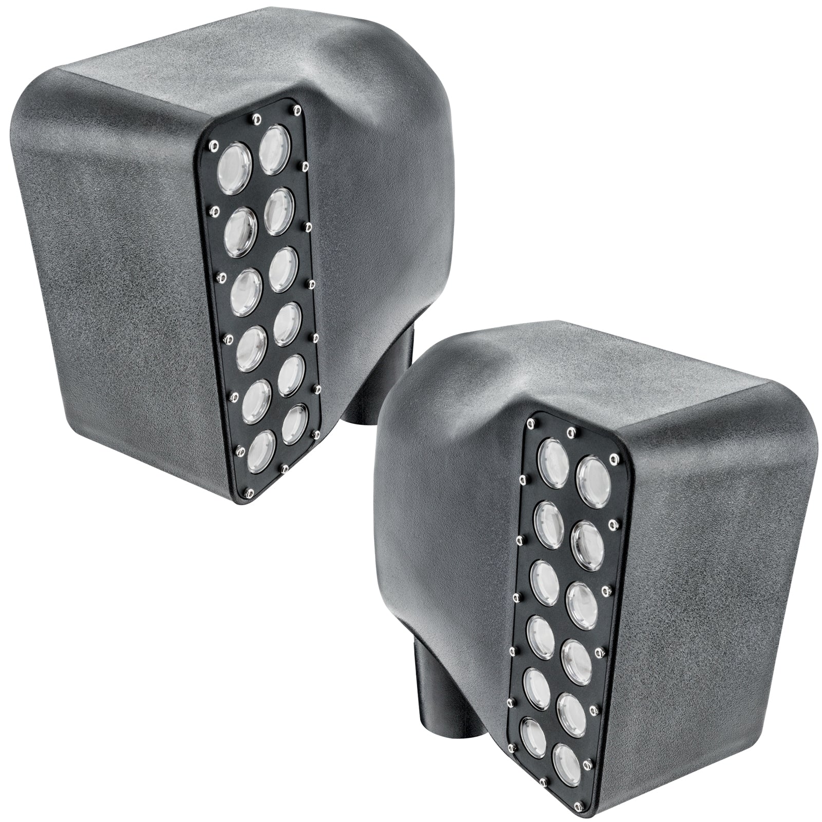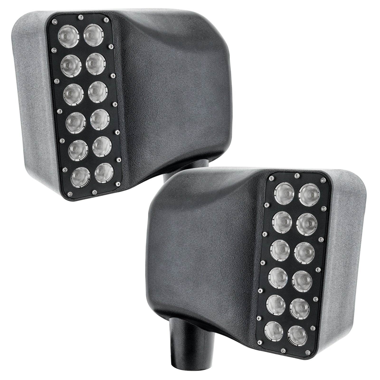 This innovative new product from ORACLE Lighting features a set of high powered LED light bars integrated into factory-style side mirrors of the Jeep Wrangler JK. This integration allows for easy installation and a clean, almost OEM look while providing functional peripheral illumination for the driver. The LEDs are custom design that features a total of 24 LEDs producing approximately 2250 Lm. Each unit has a 45 beam angle to optimize the driver's peripheral visibility. Ideally for off-road activities, such as trail riding, the driver needs to be able to clearly see the area on the sides of the trail to spot obstructions, which would otherwise go unnoticed and could be a potential hazard. Besides being functional these new LED Mirrors from ORACLE Lighting look great as well! The LED light bar is a custom design that features a total of 24 powerful Cree LEDs. This gives the driver a increased visibility and peripheral illumination. Each unit has a 45 beam angle to optimize the driver's peripheral visibility weather riding on the trail or in the desert. Multiple aluminum heat sinks are used to effectively wick heat away from the LEDs and are designed to use the airflow through the mirror housing to increase cooling similar to a radiator. The housing material is made from rugged Poly-carbonate which is 2x stronger than the factory ABS housing and bolts onto the vehicle using the factory mounts. A set of anodized rock guards protects the LED acrylic lenses, which also houses the DBM Reflex LED optics. These efficient optics focus the light for optimal visibility from the driver seat position. The Side mirror is the only part of the vehicle designed to be in the driver field of vision wheel driving, this makes it an ideal location to mount effective and functional lighting to enhance driver visibility during night-time trail rides.