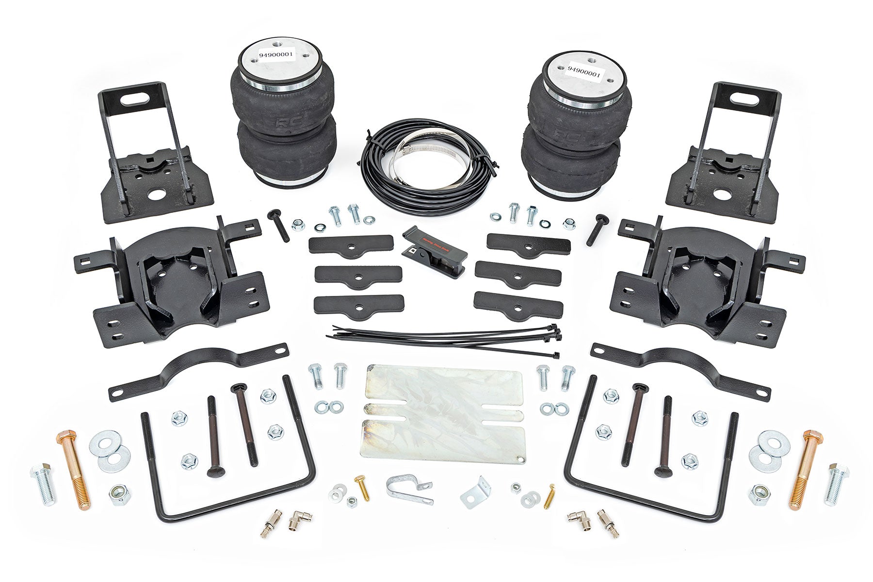 Ideal Leveling: Is your truck your workhorse? The main attraction of a pickup is the ability to haul and tow as needed. However, due to the weight in the bed or the condition of the rear leaf springs, your vehicle may become un-level under load. At Rough Country, we've designed a solution to eliminate these concerns. Introducing Rough Country's Rear Air Spring Kit. Heavy-Duty Construction: Rough Country's Rear Air Spring Kit includes two high-quality, double convoluted air bags, reinforced with durable powder-coated steel brackets and DOT-approved airlines. Whether you're towing a trailer or hauling heavy loads, this kit helps ensure your vehicle remains level, alleviating the strain on your trailer's tongue weight. The kit features 1/4" push-to-connect air fittings for easy installation, along with all necessary bracketry for a secure fit. Rough Country's Air Spring Kit supports up to 5,000 lbs. of load, minimizing sway and preventing bottoming out while braking and steering. Easy Installation: Quick and simple setup for immediate use. Rough Country's kit can be installed at home with standard tools in just 5-6 hours, ensuring minimal downtime and fast, hassle-free installation. Onboard Air Compressor and Wireless Controller: For added convenience, Rough Country offers an optional onboard air compressor and wireless controller to easily adjust your air spring kit on the go. Control air pressure at the push of a button from the comfort of your vehicle. Reliable Warranty Coverage: Rough Country's Rear Air Spring Kit includes a limited lifetime warranty on the air springs and a two-year replacement warranty on the compressor, offering lasting protection against manufacturer defects. This industry-leading coverage ensures confidence in both quality and durability, so you can count on Rough Country to keep your truck performing at its best.