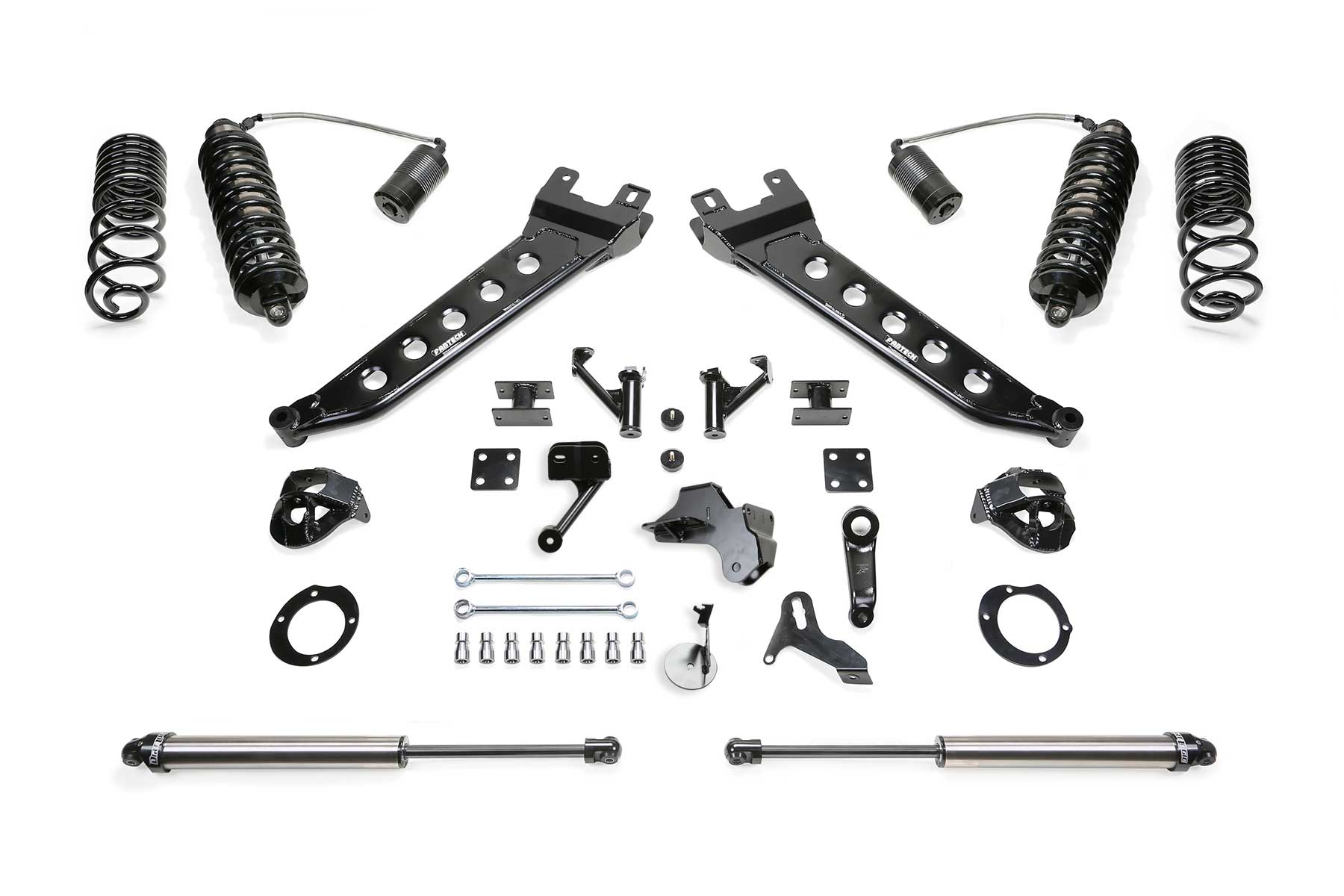 Improving on the Ram suspension design, Fabtech offers their trademark Radius Arms in a complete lift kit. These exclusive tubular Radius Arms have recognizable dimple die side plates for superior strength and a signature of quality. The rugged Arms provide increased caster for use with oversized tires and lifted suspension heights. For maximum suspension damping, this Ram lift kit features the massive stainless steel Dirt Logic 4.0 Coilovers. These top shelf Coilovers bolt to the factory upper coil bucket with support gussets for superior strength. The lower mounts weld to the axle housing and have cross support gussets for the factory Track Bar bracket. Heavy duty 1/4in thick steel front and rear Track Bar drop brackets center the axles under the vehicle with the new ride height. For the rear, this lift kit has the perfect balance between ride quality and retaining the factory carrying capacity. By utilizing a dual rate spring design, it provides a good highway ride in the first stage of compression then the second stage handles heavy loads. This high end lift kit system is the ultimate suspension upgrade for Ram 2500. FEATURES: Fabtech's trademark Radius Arms with recognizable dimple die side plates providing additional strength and increased caster. Bolt on Ram Coilover Conversion for the best ride quality on and offroad. Heavy duty Track Bar drop brackets center the axles under vehicle for proper tracking. Dual rate rear coil springs for factory load capacity and a smooth ride. Includes Free 5 year 60,000 mile Powertrain warranty. RADIUS ARM: Tubular construction with dimple die side plates for superior strength. Arms are offset to allow for full turning radius with wide tires. Fabtech Radius Arms have 1 degree of caster built in for the increased ride height. Adjustable alignment cams on the Arms allow for an additional 1.5-2 degrees of caster adjustment over stock. FRONT DIRT LOGIC 4.0 RESI COILOVERS: Super stout 1/4" thick steel brackets utiliz